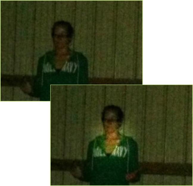 Carly is still experiencing a lot of spirit activity (as described in my previous post), which she’s capturing in photos and video. In the enhancement below you can see two or three spirit faces, reminiscent of the spirit-face photos I used to take with a Polaroid camera in the presence of the luminator. (Read more…) Carly was using a regular digital camera in this selfie.