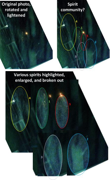 This photo (adapted from the previous article) appears to be part of a spirit community in the second spirit level or shadow world of the Earth. These are what I perceive as some of the confused, troubled spirits in the picture. I list them numerically, in the order of how clear and easy they are to identify, starting with the clearest: 1) an unclothed man standing in profile; 2) a man in a long, beige suit coat with arms raised, also in profile; 3) a girl in a dress walking toward our right; 4) three or four men and women standing near the unclothed guy; and 5) a man in a long, dark coat standing in profile. Some of the figures are not easy to make out… but perhaps you get the idea. It’s not a peaceful, paradise place… this shadow world. It’s inhabited by some lost souls whose troubled thinking spills over into our world.