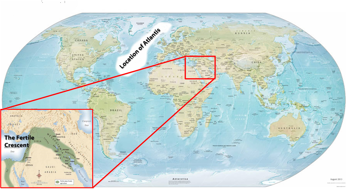 30000 to 10000 BC – The area was a desert environment rife with oases and lakes produced by the abundant, annual flooding of the River Nile. The tribes of late Paleolithic, Mesolithic, and early Neolithic people were using stone chisels and blades as sculpting tools, arrowheads, and sickles… including precision blades less than 3cm long. The people were for the most part hunters and gatherers, with many small settlements scattered throughout the Nile Valley. (Various races of noble-savage humans, including Cro-Magnon, had been evolving rather quickly among the islands of Atlantis, through improvisational engineering by the advanced Atlanteans. Advanced technologies would occasionally get out of hand and cause major geologic upheavals, especially one around 18000 BC and another around 12000 BC. Members of the new breeds of humans emigrated or fled from the destabilizing island civilization into the wilderness frontiers of the larger continents that today are called the Americas, Europe, Asia, and Africa. The Fertile Crescent (see map) was an appealing destination. Near the end of this period came the final destruction of the main territories of Atlantis.)