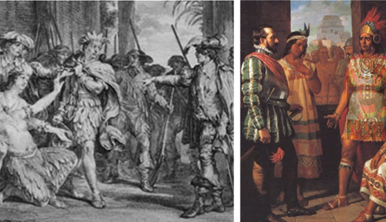 Early artworks depict Inca leader Atahualpa being tried and sentenced in 1533 by Spanish conquistadors, to the horror of attending tribeswomen… who kill themselves following the hanging of their beloved leader. The sketch on the left is probably a more accurate depiction of both the feathered clothing and the fevered passion of the moment. A death sentence seems inconceivable to the Inca people and their leader, who’ve been generous, accepting, and friendly toward the visiting Europeans. Unfortunately, the Spaniards at the time are still emerging from centuries of brutal injustice throughout Europe, starting with the Medieval Inquisition around 1200, and following up with witch trials of the late 1400s, and the Spanish Inquisition that is still raging well into the 1500s.