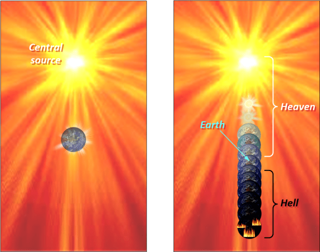 Right: If we could start pulling the various spirit realms apart from each other like an accordion file, the Earth would be in the middle. The spirit realms above Earth in the diagram are what we typically call heavens, and the realms below Earth are typically called hells. From the Earth downward, the vibration of each level gets denser and darker. From the Earth upward, the vibration gets ever subtler and lighter… until we reach the central source, which emits a pure, nonvibrating light or consciousness. That “breath of God” flows through the entire omniverse, vibrating slower and slower as it moves out-beyond… endowing everything in its path with life force. Apparently the life force gets a little weak and unstable by the time it gets all the way out to the material universe, which probably accounts for the “7 levels of hell.”