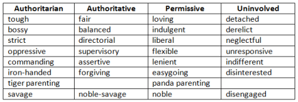 Four parenting styles are often cited for shaping kids’ attitudes and behavior in distinct ways. The bottom row contains terms I often use. Savage child-rearing would probably work best if we lived in a purely savage, dog-eat-dog world. Noble child-rearing would probably work best in a paradise world in which love, trust, good will, and moderation were a universal way of life. The “authoritative” approach seems best suited for this noble-savage Earth.