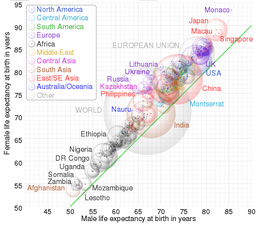 If you have a few minutes and an inclination to ponder on population and life expectancy in today’s world, click on this picture to open an interactive diagram (very well done by Cmglee).