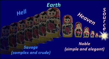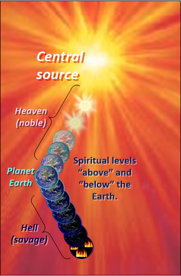 Picture below: Heaven and Earth (but not hell) are nested neatly inside each other like Russian nested dolls. At the center or innermost position of those nested dolls is the source (far right). Hell, on the other hand, consists of tormented worlds—flawed copies of Earth—that are rife with dark thoughts and unsavory behavior of people on Earth. The hellish realms are far removed from the source… as though they exist in Earth’s shadow and are not really part of the nested set of dolls. Again, we explore the reasons in this article.