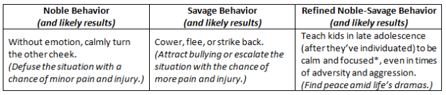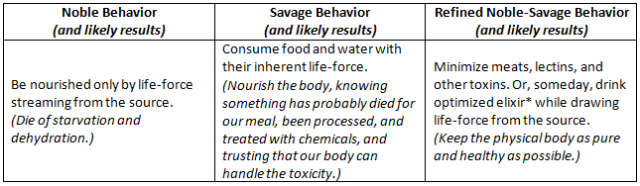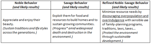 The following tables use a few examples (just to give a general idea) of how we humans might behave in various situations or in response to certain actions… whether nobly, savagely, or in a refined noble-savage way. That third column gives a sense of how we can refine our behavior through sound management at the personal, social, and planetary levels. We’ll explore a few specifics after the tables.