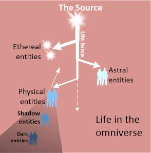Life-force from the source streams abundantly throughout the omniverse, spreading life, love, joy, and understanding. When it reaches Earth, some gets deflected by the savage qualities of the planet, and a sort of shadow is cast that becomes a dark, confused spirit-place of suffering.  Some of the darkness from the shadows cycles back to Earth, so some amount of suffering is unavoidable in our world.