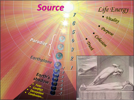 Why we picture hell “down below.” The earthplane and Earth’s shadow blanket our world like fuzz on a peach. But those dark, unsavory worlds don’t adhere tightly to the planet like peach fuzz; it’s more likely that they form a sort of thick, wobbly bubble of spiritual residue around the Earth that might extend a little bit “above” the surface of the planet and to a larger degree “within” the planet.
