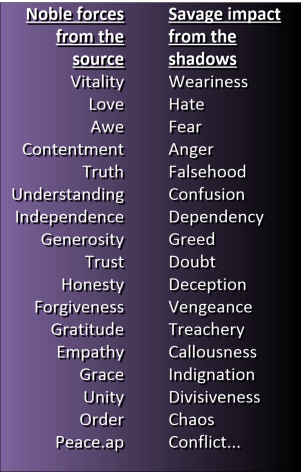 As life-energy from the source fills the omniverse with noble motivations, some of it is deflected by the brutal, predatory nature of life on Earth… casting a spiritual shadow around our world that’s filled with fear, deception, and other savage motivations listed in the right-hand column of the table above.