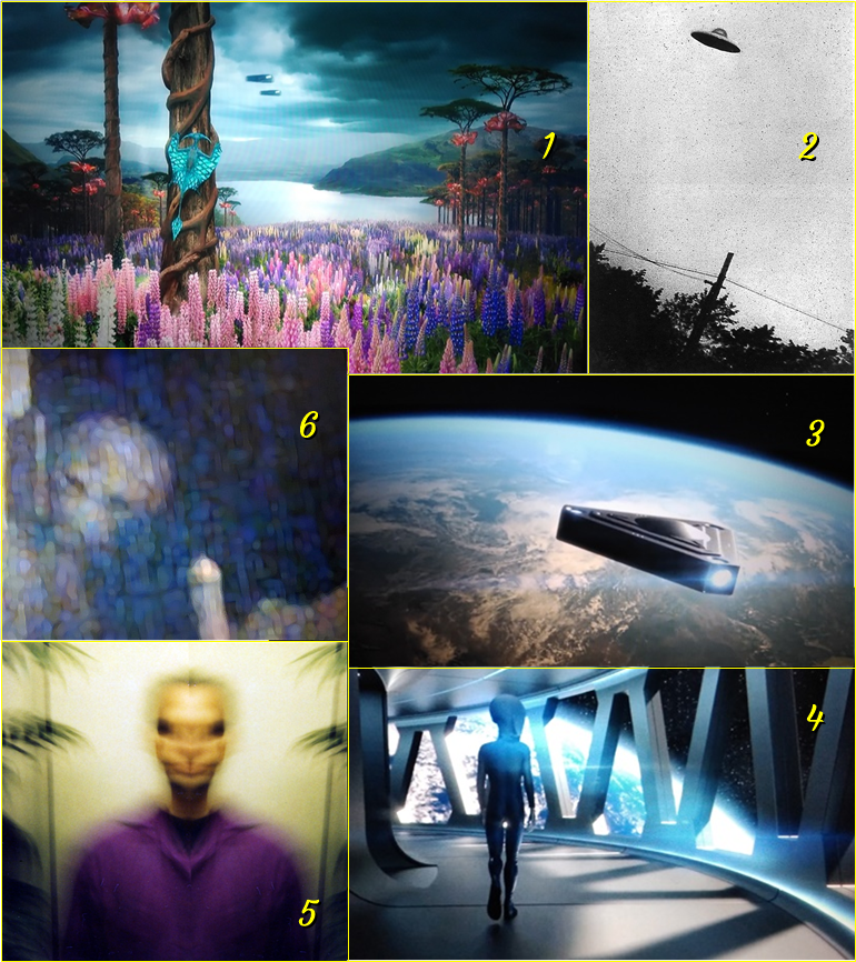 1) artist rendition of the quasi-physical paradise Essassani, with two ships overhead (Darryl Anka’s “First Contact” film),