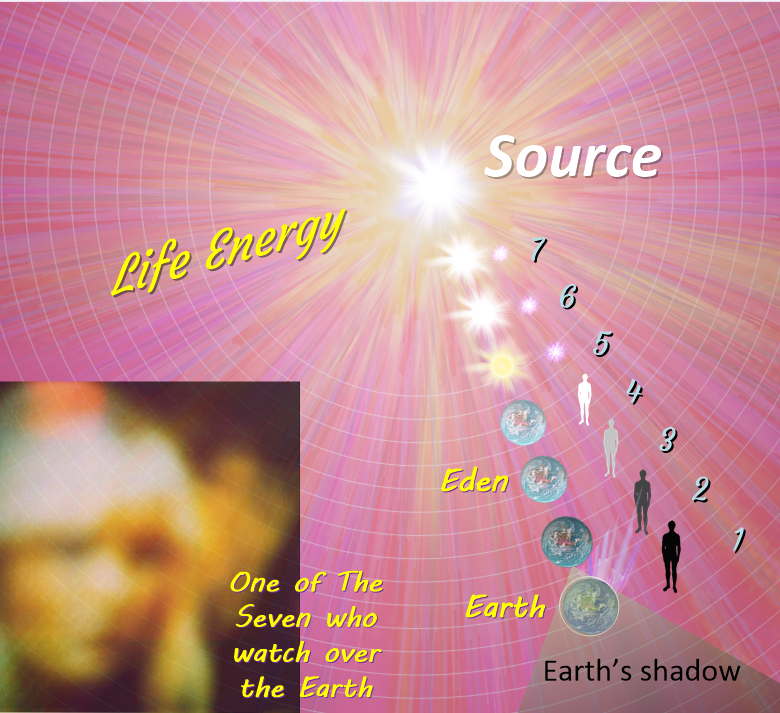Most people awaken at level 3 after they die, with astral bodies that closely resemble the physical bodies they’ve left behind. It’s an earth-like paradise where many of our ancestors are living in surroundings similar to what they’d known on Earth, but under paradise conditions. The Seven themselves move among many worlds and universes in the course of their service, but one of their main tasks is to monitor and assist Earth and its afterlife copies or templates like the one at level 3 that goes by various names, including Eden. Their main purpose for Earth is to urge life here—humanity in particular—to become more peaceful despite the brutal symbiosis that emerged on (or was implanted in or was foisted upon) our planet long ago.
