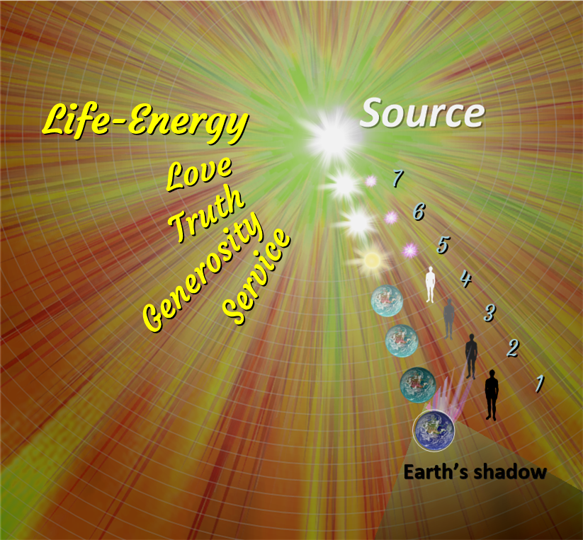 The source (God, Allah, Brahman…) emits a life-energy that creates and nourishes everything in many parallel universes (fine, white circles), which can be divided into seven arbitrary levels. The interactions between our physical self (level 1) and our subtle selves determine our fate. Karma is one of those interactions.