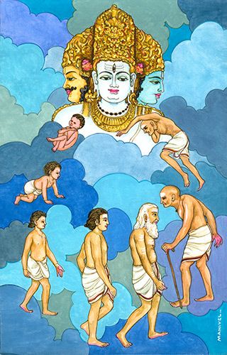 At the center of everything is the source, depicted here as the three primordial forces of Hinduism: Brahma (creator), Vishnu (preserver), and Shiva (destroyer). Simply put, we humans emerge from the source, live a lifetime, then return to the source. Then we do it all over again (and again and again…) until the cycle of reincarnation is complete.