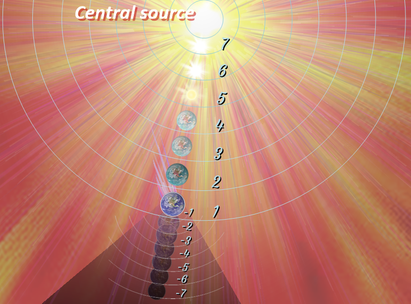 The source emits a life-energy that creates and nourishes everything in the omniverse with vitality, love, truth, and service. As the pure life-energy leaves the source, it begins to vibrate very fast, then slower and slower as it moves out-beyond to create denser realms like our own material universe (one of the fine, white circles at level 1). As the vibrations get slower, all of the universes and worlds become less pure, more illusory.