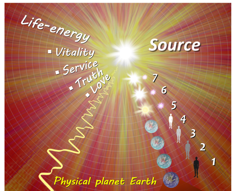 - Worlds of slightly diminished life energy further removed from the source (levels 5-3), where entities gravitate into like-minded groups that coexist peacefully with each other in a respectful, live-and-let-live way.