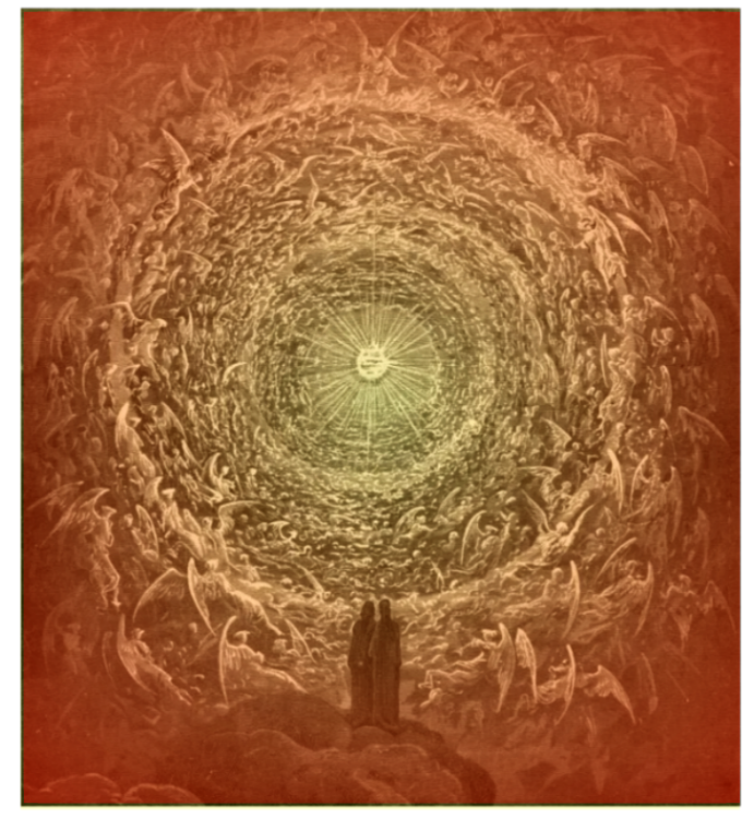 Closest to the source (levels 7, 6, and 5) is a vast realm where light beings and energy beings get along in a resonant, win-win scenario. These are the bright, magnificent realms perceived by visionaries like Dante Alighieri and artists like Gustave Dore (right). We can imagine these vast, ethereal realms spiraling out from the source, devolving ever so slightly along the way.