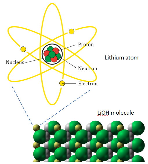 Atoms and molecules are basic building blocks of matter. Lithium hydroxide (LiOH) molecules, for example, are each made of 1 lithium atom (shown as yellow) and 1 hydroxide molecule (green and silver), which in turn is made of 1 hydrogen atom (silver) and 1 oxygen atom (green) bonded together. Each atom has electrons around a nucleus containing protons and neutrons. (Lithium atom and LiOH molecule diagrams courtesy of Wikipedia.)