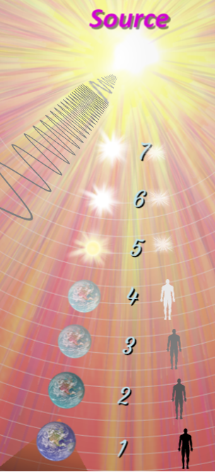 Superimposed over our body and our planet and everything else here at level 1 (physical realm) there are spirit bodies in finer dimensions… in subtler universes (fine white circles) leading toward the source. The entire cosmos can be divided into 7 arbitrary or random levels. Life-energies are the essence of everything. Earthly and universal (electromagnetic) energies are what we can perceive here at level 1.