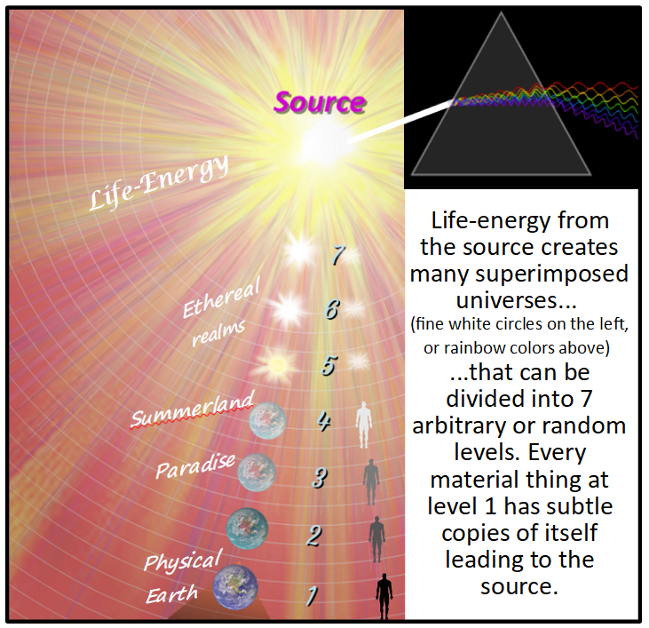 The source (what religions call God, Yahweh, Allah or Brahman), emits life-energy as though passing it through a prism, manifesting a rich, cosmic rainbow of living universes all superimposed over each other but remaining distinct by their vibration… like radio, WiFi, and Bluetooth signals in the same room.