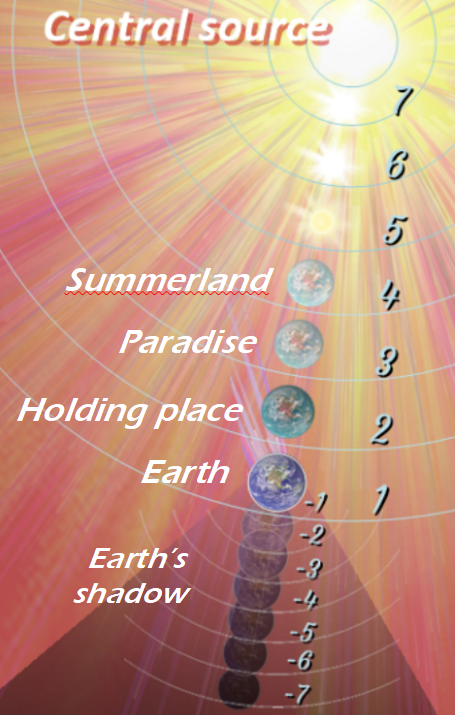 To put it all into perspective, life-energy from the source spreads vitality, love, honesty, trust, and other fine motivations to sustain peace and coherence throughout the cosmos. Some of the life-energy gets deflected by Earth’s rowdy nature, casting a spiritual shadow of vileness, hate, deception, skepticism, and other destructive motivations that have nowhere else to go, so they get stuck around the planet like an invisible storm cloud… as shown in this pulled-apart diagram of the seven light, brilliant levels of the superimposed cosmos (and the seven dark, negative levels of Earth’s shadow).