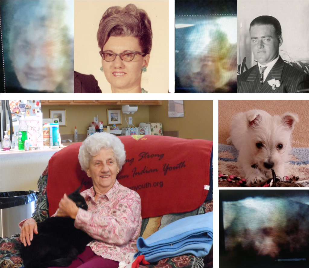 • Simone Santos (Brazil, living in Seattle USA since 2006) has received many recognizable faces of her clients’ deceased loved ones (for example, Fernanda 1, Fernanda 2, Rayme, and Sidney). Simone uses a variety of video and audio equipment, including TVs (both new LED models and old vacuum tube models), camcorders (some with night vision and infrared capabilities), advanced audio recording equipment, and “ghost boxes.”
