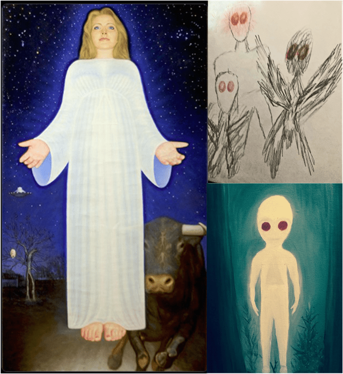 These are some of the non-earthly beings Chris has been in touch with since his first UFO encounter in 2007. The Lady of Light was painted by artist Doug Auld based on Chris’s descriptions. Chris himself sketched the shadow people and ET (top right) shortly after that first traumatic encounter. He painted the ET below it a couple of years later. (We’ll take a closer look at these pictures and their backstories after the article.)