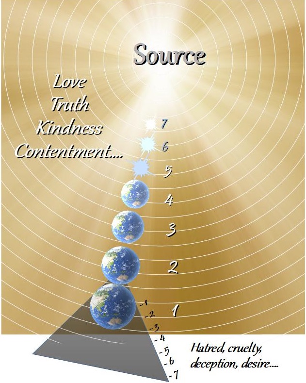 This pulled-apart diagram shows the source (God, Allah, Brahman… ) at the center of everything, emitting its rich life-energy that spreads vitality, purpose, goodness, and understanding throughout the vast, superimposed cosmos. When the life-energy reaches the physical planet Earth (level 1), much of it gets deflected by the rowdy dramas going on here—living things intentionally hurting and killing each other, taking stuff from each other, lording over each other…—and a spiritual shadow is cast around the planet.