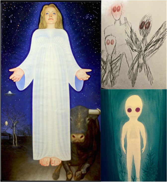 These are some of the non-earthly beings Chris has been in touch with since his first UFO encounter in 2007. The Lady of Light was painted by artist Doug Auld based on Chris’s descriptions. Chris himself sketched the shadow people and ET (top right) shortly after that first traumatic encounter. He painted the ET below it a couple of years later. (We’ll take a closer look at these pictures and their backstories after the article.)