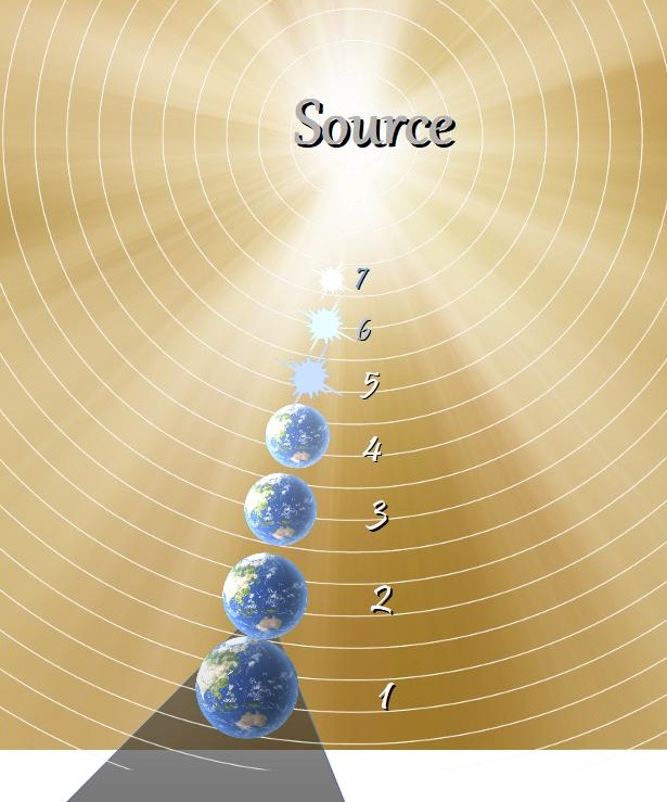 This pulled-apart diagram shows the source (God, Allah, Brahman… ) at the center of everything, emitting its rich life-energy that spreads vitality, purpose, goodness, and understanding throughout the vast, superimposed cosmos. When the life-energy reaches the physical planet Earth (level 1), much of it gets deflected by the rowdy dramas going on here—living things intentionally hurting and killing each other, taking stuff from each other, lording over each other…—and a spiritual shadow is cast around the planet.