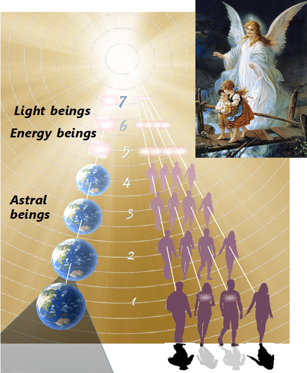 Explanation: Spirits at level 3 still look and act like refined Earth people. They use their hands to create, their feet to walk, cars and aircraft to travel, and houses to live in. They’re kind and respectful of each other and migrate naturally into communities of like-minded people. Spirit people at level 4 are even more refined. They can travel mentally to distant worlds, and they can create things just by thinking about them. But they still have a rarefied, human-like appearance. Worlds at levels 5 and 6 are inhabited by energy beings, who no longer have bodies of familiar form, but exist rather as energy. Levels 6 and 7 are inhabited by light beings—brilliant, formless, star-like beings who can create and help manage worlds throughout the cosmos. All of their “work” is accomplished by focused intent. They all have brilliant, powerful, focused minds.