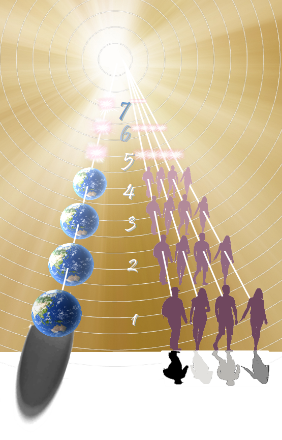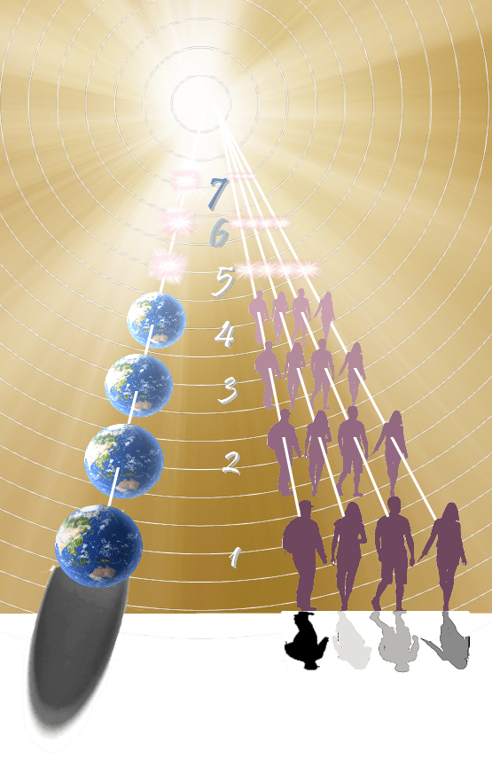 Between the source and the earth, at the various levels, we find: 7) Unimaginably powerful light beings. 6) Light beings and energy beings. 5) Formless energy beings that are like cohesive clouds of consciousness. Purifed people who enter level 5 after a lifetime on Earth feel like they’ve come home, as they’re drawn back into tight-knit spiritual communities from which they’d incarnated into their recent lifetime. These level 5 communities evolve and consolidate into ever larger communities through level 6 and level 7 (where I suspect they can be as massive as a star). 4) The polished “Summerland” paradise, where living form starts to melt away into living energy. 3) Our afterlife paradise of subtle, nonphysical earth-like structures that feel solid and real to the spirit inhabitants. 2) A holding place where dense, unruly spirit people from Earth can cleanse themselves a bit (emotionally and spiritually) before entering the level 3 paradise. 1) Earth life with its scrappy symbiosis.