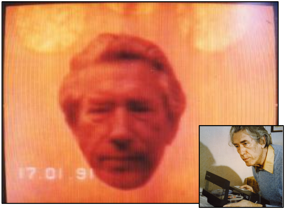 Swedish experimenter Friedrich Juergenson in lifetime (inset below right) and in his spirit body, showing the three suns of Eden. The spirit picture was delivered to the color TV of ITC researcher Adolf Homes of Rivenich, Germany.