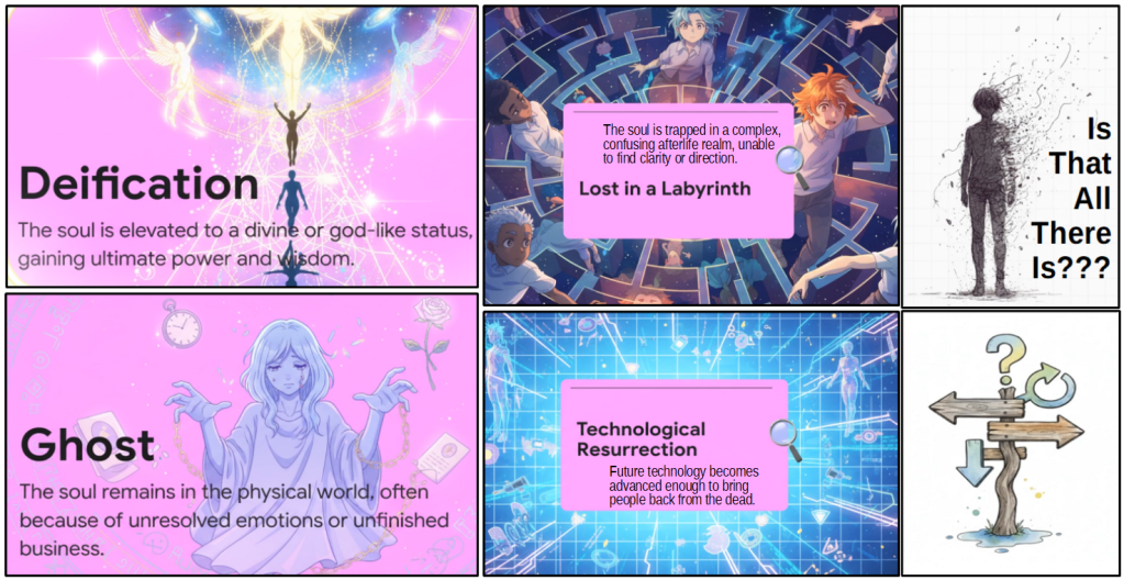 Top left: After a lifetime on Earth, we ascend to light, ethereal realms… Bottom left: We stay near the Earth as “ghosts” after we die… Top center: We awaken, lost in the dark… Bottom center: Technological advances can bring us back to Earth after we’ve died… Top right: Our dead body simply dissipates, and there is no “afterlife”… Bottom right: In any case, the afterlife is a puzzle to most people today.
