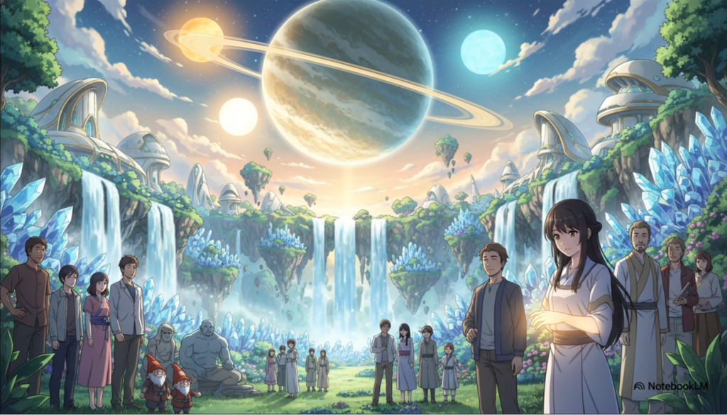 Note: This is first in a series of glimpses into the superimposed, many-dimensional cosmos, using illustrations and just enough supporting text to get the messages across. If a good picture is worth a thousand words, then hopefully the message in each of these articles can be cut down from a few thousand words to a few hundred. (The pictures are AI-generated in the popular anime or manga style.)