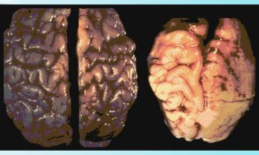 Brains of babies in utero are especially graphic… at left, a normal brain; at right, the brain of a fetus with fetal alcohol syndrome (caused by alcohol in the mother’s system).