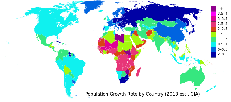 Population growth rate: Blue nations are the most stable and would be well suited to a Basic Income program. Green countries are on the border and could also accommodate Basic Income. The yellows, oranges, reds and purples indicate countries with precarious population growth, which would have to be gotten under control before Basic Income (or any other economic solution) would really help.