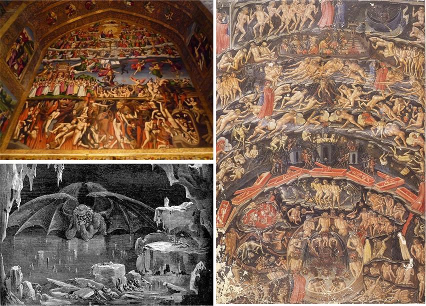 Clockwise from top left: 1) mural in Vank Cathedral (Isfahan, Iran), 2) Dante’s Inferno depiction, 3) a Gustave Doré illustration