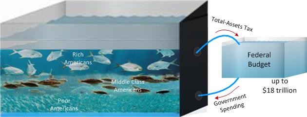 Taxing the total assets of all Americans (households, businesses, banks…) anywhere from 1 to 10 percent would drastically reduce inequalities in the US economy while kick-starting a Basic Income program and paying off some or all of the national debt.